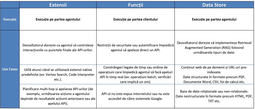Pe scurt, extensiile, funcțiile și depozitele de date reprezintă diferite tipuri de instrumente disponibile pentru agenți în timpul execuției. Fiecare are un scop specific și pot fi utilizate împreună sau independent, în funcție de decizia dezvoltatorului agentului.
