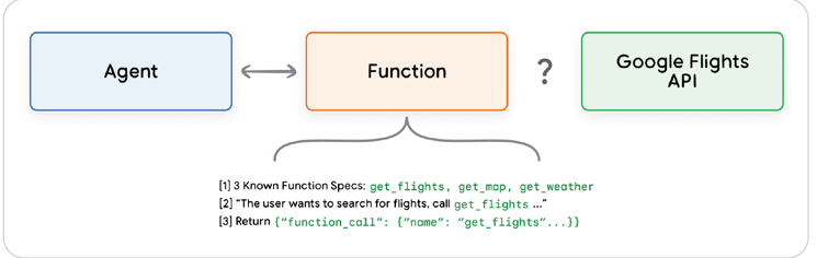 În lumea agenților, funcțiile funcționează într-un mod similar, însă dezvoltatorul software este înlocuit cu un model. Modelul poate utiliza un set de funcții cunoscute, decide când să folosească o anumită funcție și ce argumente sunt necesare, pe baza specificațiilor acesteia.