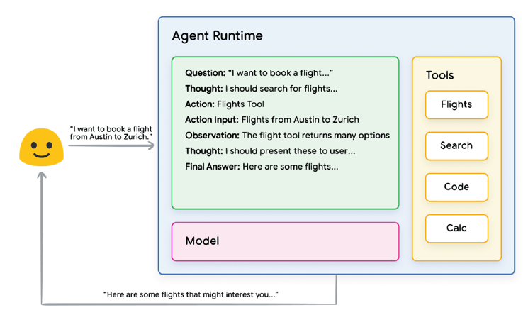 Așa cum este ilustrat în Figura , modelul, instrumentele și configurația agentului lucrează împreună pentru a oferi un răspuns fundamentat și concis utilizatorului, pe baza interogării inițiale. În loc ca modelul să ghicească un răspuns (generând halucinații) bazat pe cunoștințele sale anterioare, acesta a utilizat un instrument (de exemplu, „Flights”) pentru a căuta informații externe în timp real. Aceste informații suplimentare au fost furnizate modelului, permițându-i să ia o decizie mai bine informată, bazată pe date reale și să rezume aceste informații pentru utilizator.